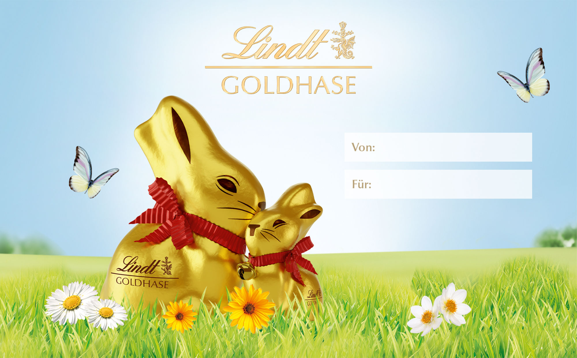 Der Teilnehmer kauft zwei 100g GOLDHASEN und lädt den Kassenbon in ausreichender Lesbarkeit unter www.lindt.de/Ostergruss hoch.