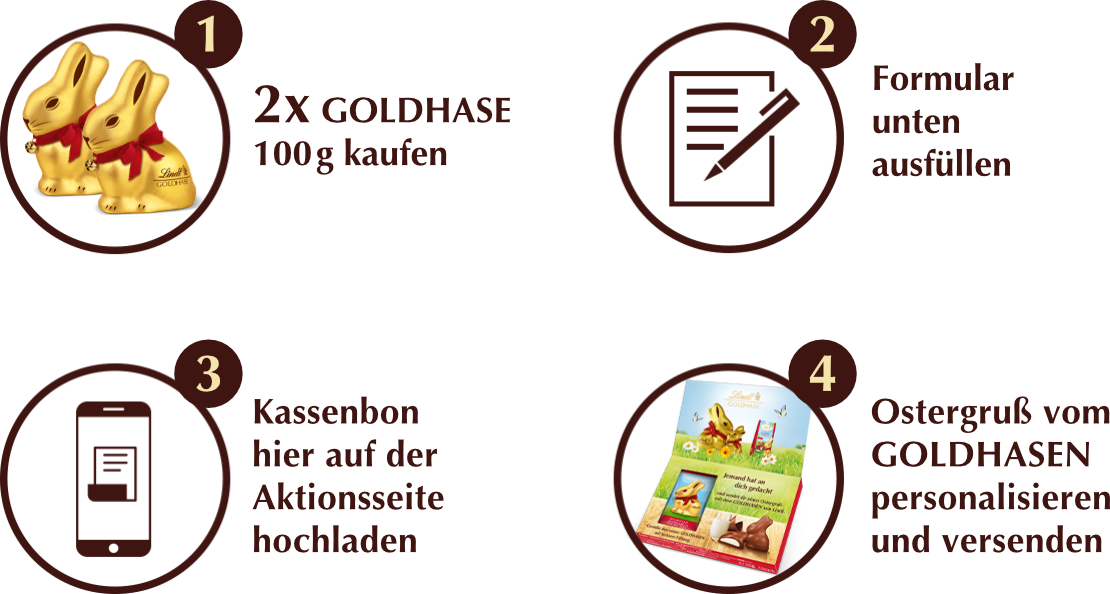 Der Teilnehmer kauft zwei 100g GOLDHASEN und lädt den Kassenbon in ausreichender Lesbarkeit unter www.lindt.de/Ostergruss hoch.